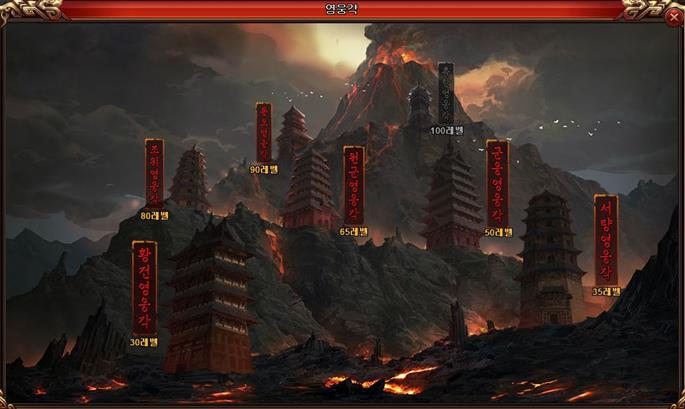 용맹/강익/견인/열광/기혈/민첩/영예/절기/냉정 을 어느정도 맞추어 주면 영웅각에서 쉽게 클리어 가능합니다